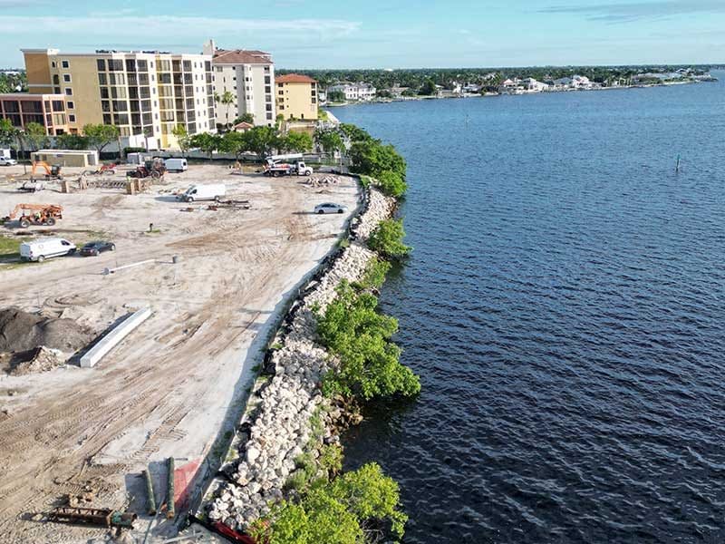 Aerial view of a large park in Southwest Florida with open green space, walkways, scattered palm trees, small buildings, and a waterfront in the background—an ideal landscape for thoughtful construction management.