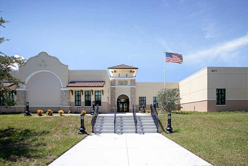 Exterior view of the Punta Gorda Charlotte Library building in Southwest Florida, featuring an arched entryway, palm trees, and a clear sky.
