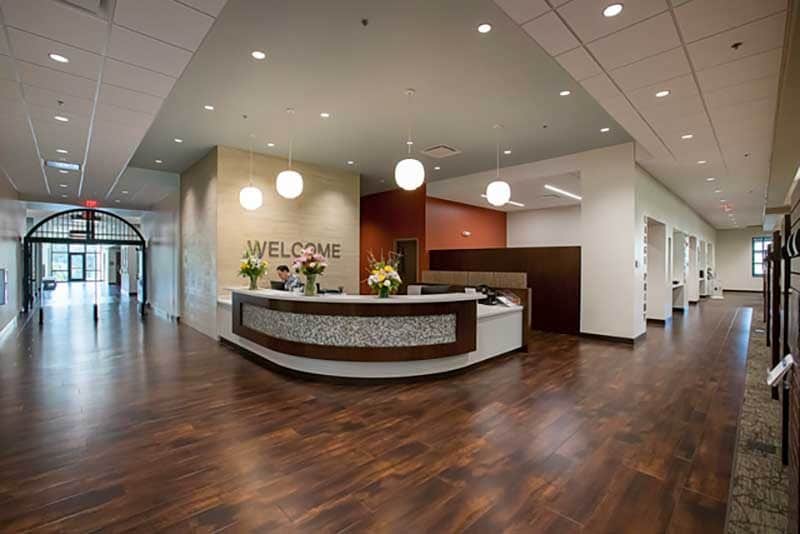 • Covered entry on the parking lot side of the building, including an extended walkway to the parking area